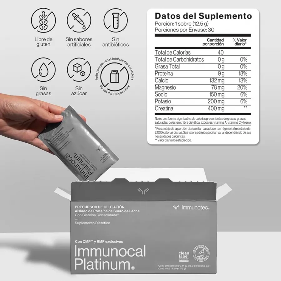 Immunocal de Immunotec es un aislado de proteína de suero de leche de alto valor biológico, formulado para elevar los niveles de glutatión, el antioxidante maestro del cuerpo. Ayuda a fortalecer el sistema inmunológico, desintoxicar, mejorar la energía y la función celular, respaldado por estudios científicos.